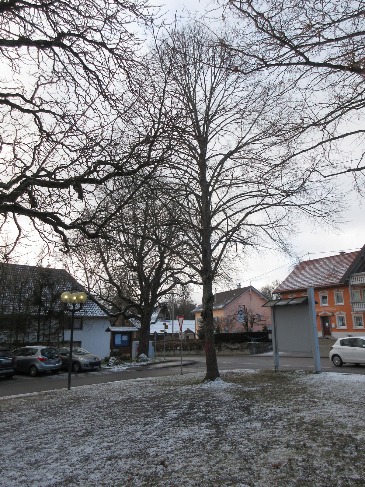 Um den Bau des Ärztehauses realisieren zu können, müssen mehrere Bäume entlang der vorhandenen Parkplätze (Zufahrt Festplatz) gefällt werden sowie die beiden großen Bäume auf dem Foto.