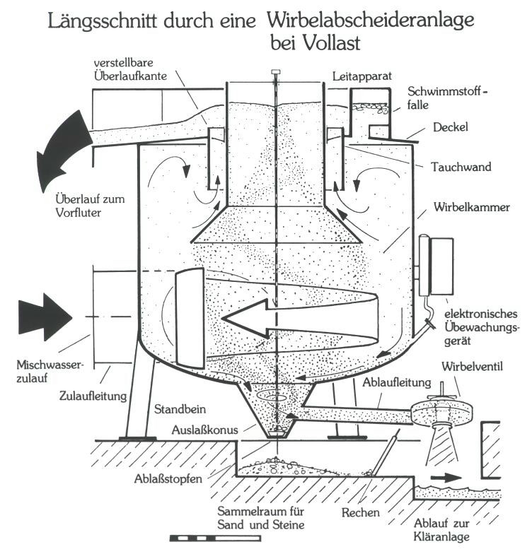 Der Entwurf und die Bemessung der Abscheideranlage geht auf ausführliche hydrologische Untersuchungen des Einzugsgebiets zurück. Über ein Jahr lang wurde im hydraulischen Labor mit verkleinerten Modellabscheidern experimentiert, um einen möglichst großen Wirkungsgrad zu erhalten. Die Experimente zeigten, dass bei gleichem Wirkungsgrad ein Wirbelabscheider ein im Volumen etwa drei- bis viermal so großes konventionelles Regenklärbecken ersetzt.