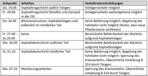 Sanierung Marktstraße Tengen – Vorläufiger Zeitplan der weiteren Arbeiten
